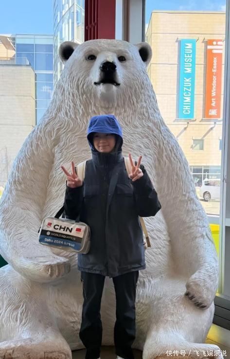 此外还有一张照片显得非常可爱,全红婵挎着一个小包包,身上还背着双肩包,正站在一个白色大熊雕像面前。